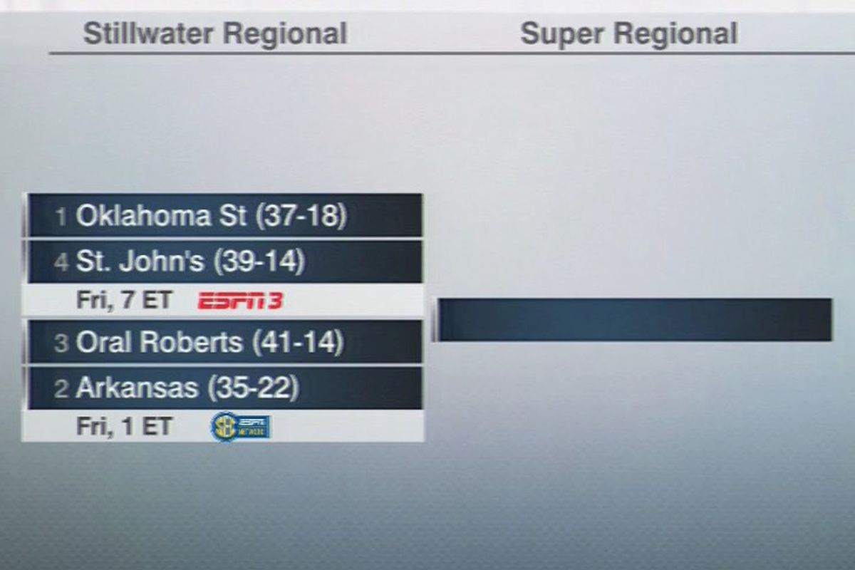 Arkansas will take on Oral Roberts Friday afternoon at noon in the first game of the regional. St. John's is the 4-seed with a 39-14 record. The Arkansas vs. Oral Roberts game will be televised on the SEC Network.