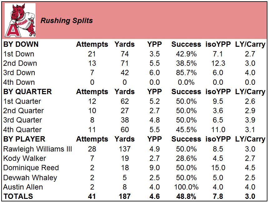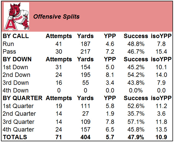 And finally, for the second straight week, the offense roared to life in the fourth quarter (overtime stats are counted as fourth-quarter in this chart). The success rate was lower (largely thanks to two three-and-outs to open the fourth: the Hog offense mostly hummed on the final drive plus overtime) but the explosiveness was higher.