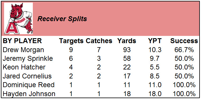 Not much to see here. As expected, Arkansas picked on TCU’s weak cornerback play by matching up its two best receivers on their outside defenders. While Keon Hatcher had the better game against Tech, Saturday was Drew Morgan’s time to shine. Morgan spent much of the game embarrassing redshirt freshman Jeff Gladney of TCU.