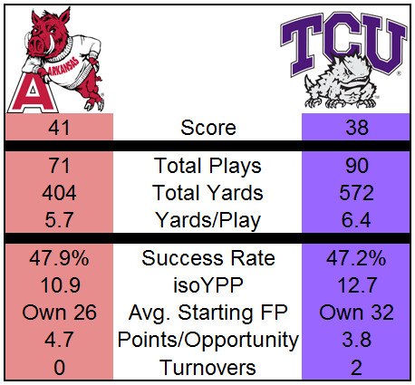 TCU was much stronger offensively, both in terms of sheer quantity (90 plays) and quality (6.4 yards per snap). Both teams were roughly equally efficient, but unsurprisingly TCU had more big plays, resulting in a higher isoYPP.