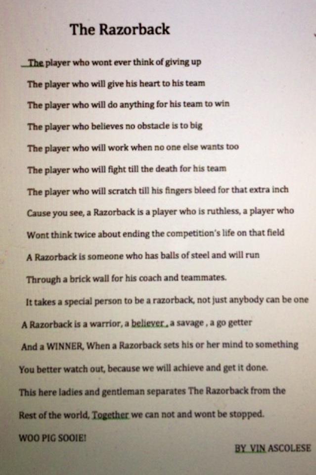 This will be taught in English lit classes throughout Arkansas for years to come. This sonnet is filled with metaphors "a Razorback is a warrior", imagery "balls of steel", and hyperbole "ending the competitions life on the field". He even acknowledges that a Razorback can be a man or woman, showing his 21st century cultural awareness.
