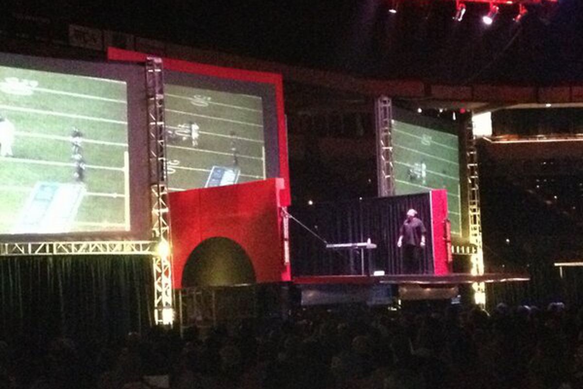This year, a special set was built for Bret Bielema. Not content with merely a table on a stage with video screens, hell no, Arkansas went the extra mile and built Bielema a special tailgating truck set. It's so huge it makes Bielema, whom is widely known to be, well, not a tiny man, look like a Disney mouse. Look for yourself: