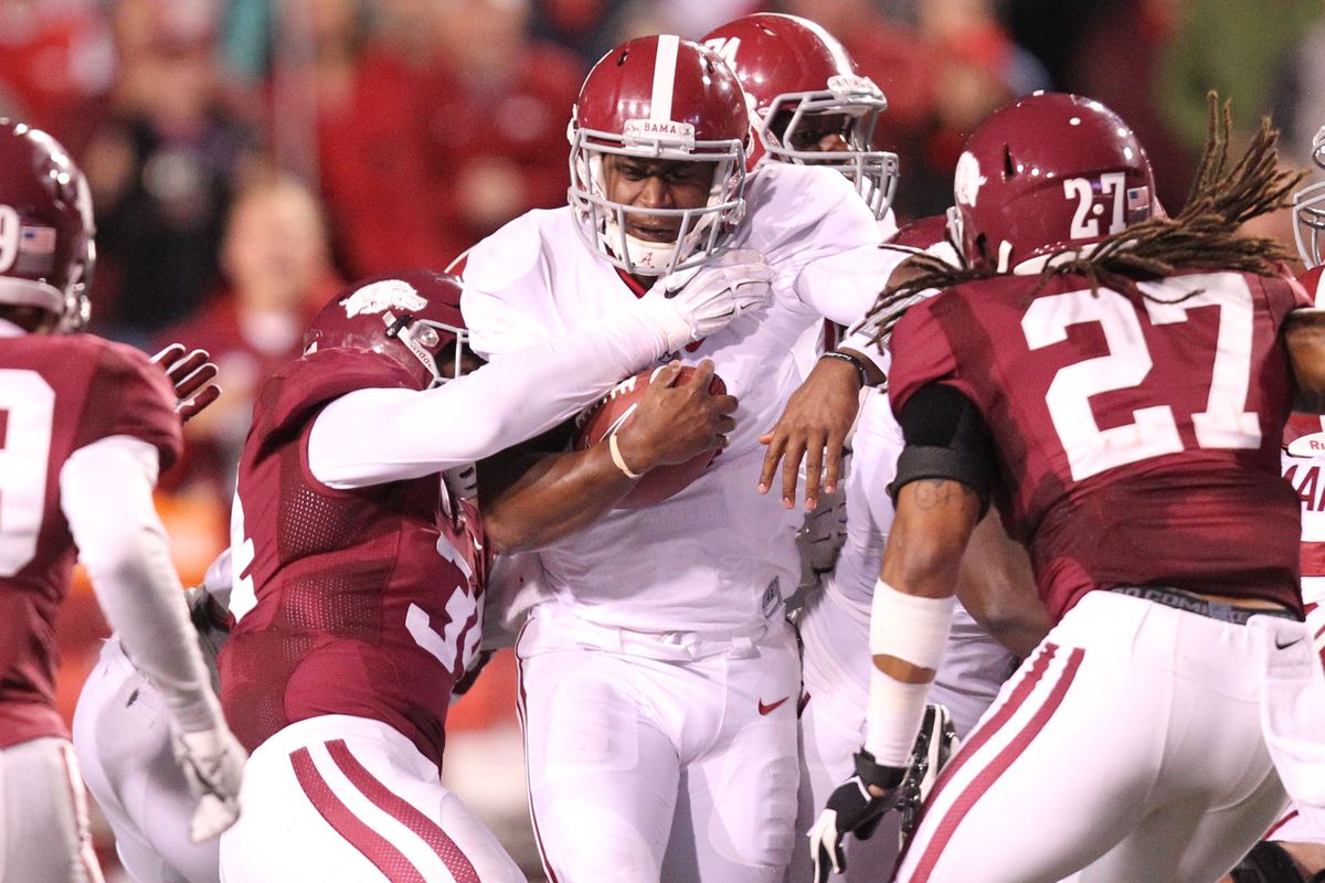 Prepare yourselves for some defensive love. Our guys played great! This is an Alabama team that may not be as strong as they were in past seasons, but they still command respect. But Arkansas' defensive line stood up and took Blake Sims to the ground on a few occasions. They only rushed for 66 yards. So much for having the best rushing game in the nation. On top of all of that the defense held Amari Cooper to 22 yards on 2 catches. Well let me just say it all starts up front.