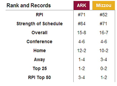 This game could make the difference in the minds of the NCAA Tourney selection committee. A split with Missouri and a pair of wins at home against LSU and South Carolina would boost Arkansas' resume. Winning at Missouri might also alleviate some of the constant road fears that have haunted Arkansas fans for several seasons.