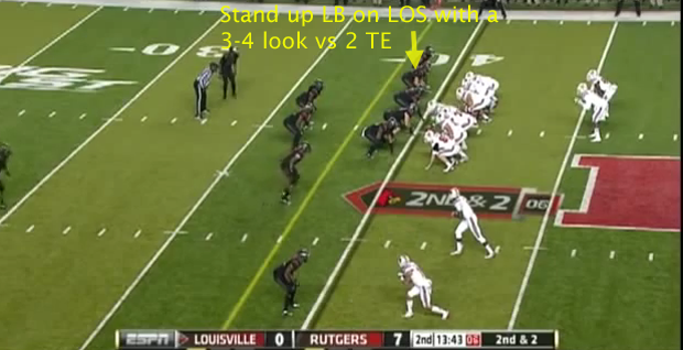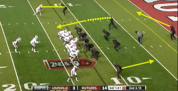 Here is an example of a Safety Blitz in the game against Louisville. They had Rutgers in the front they needed to break a big gain in the red zone, but the safety was not accounted for in the blocking scheme.