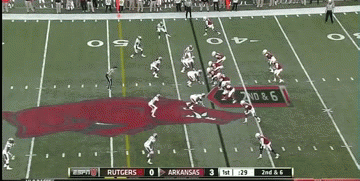 From the first drive Arkansas attempted to spread the field to create space and Cobi Hamilton had a monster game on the Rutgers secondary. On several instances Smith put his DBs in man or a pattern matching zone one on one with a WR. When his pressure up front was not able to get there quick enough Arkansas was able to gain yards on big plays.