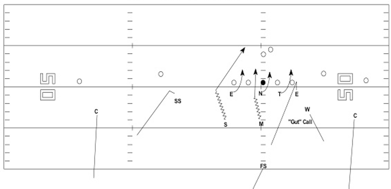Robb Smith used this adjustment as well as the base 4-3 Over. It basically eliminates any runs away from the tight end and with the safety in the box on the TE side it is also difficult to run Strong both inside and out. The use of "Overhang" players to combat power runs from the spread is a new trend that may be a way to slow down teams like Auburn, Oregon, etc. Moving the highlighted LB (or a safety) above to a position at the LOS and outside the tackle makes both the outside run game and Spread Option plays difficult for the offense to block.