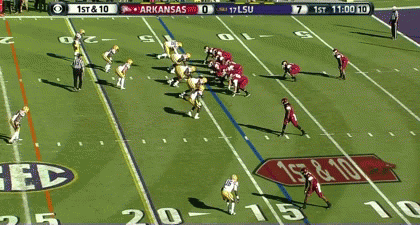 Chaney elects to call the same power play with 3 TEs where Collins is only able to pick up a short gain. This time the LSU MLB shoots inside and Swanson misses the block, which was rare but the Razorbacks are still sitting at 3rd and short.