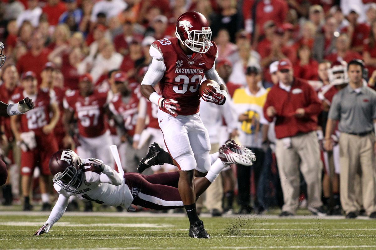 The Razorbacks' running back situation remains the same as it was when spring ball ended, with Jonathan Williams, Alex Collins and Korliss Marshall listed as "1A, 1B, and 1C." Running backs coach Joel Thomas is looking at the situation as a positive, and it's easy to see why – he has three explosive playmakers other SEC coaches would do something very illegal to have for themselves. And as we've previously noted multiple times on this site, Bielema has worked with three solid backs before and found them carries. Having three capable backs isn't a problem. The coaches call it having options.