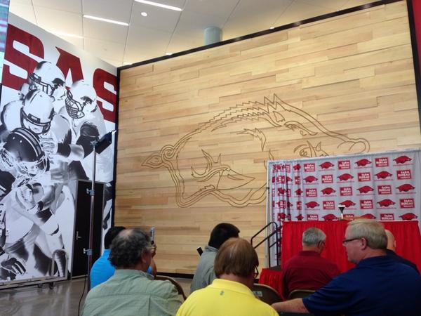Arkansas hung the Farm Bureau curtain over their impressive walls in the lobby of the FWS Football Center Sunday afternoon and it was time for Bret Bielema to address the full Arkansas media contingent.