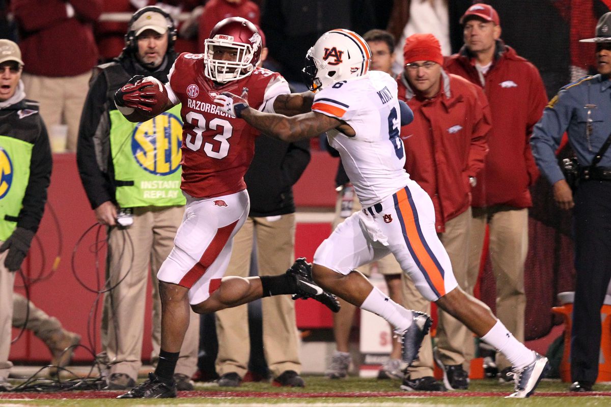 Watch the double teams on the Arkansas defensive tackles: If Philon, Hodge, Jackson, and Johnson are able to split double teams and cause havoc in the backfield the Auburn running backs will be forced to cut back or bounce. Auburn wants to double then slide to the second level. Keeping the linebackers free will be an important aspect
