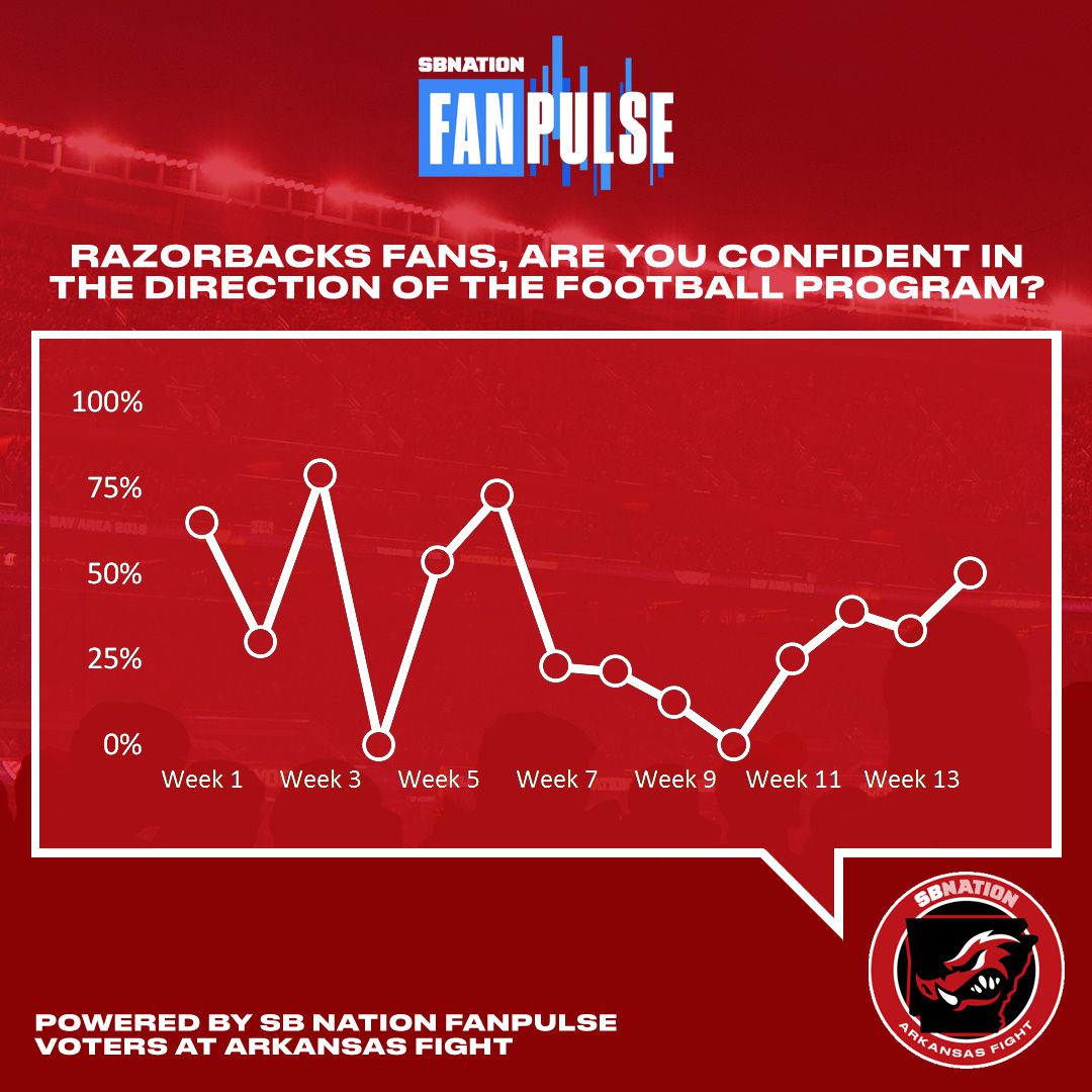 That’s right! The season ends with a bang and not a whimper by virtue of having the possibility of literally anyone else being our head football coach. It’s amazing to me that almost the minute Chad Morris got fired, confidence started rising, and now that we know the search is on, it’s back up over 50%.