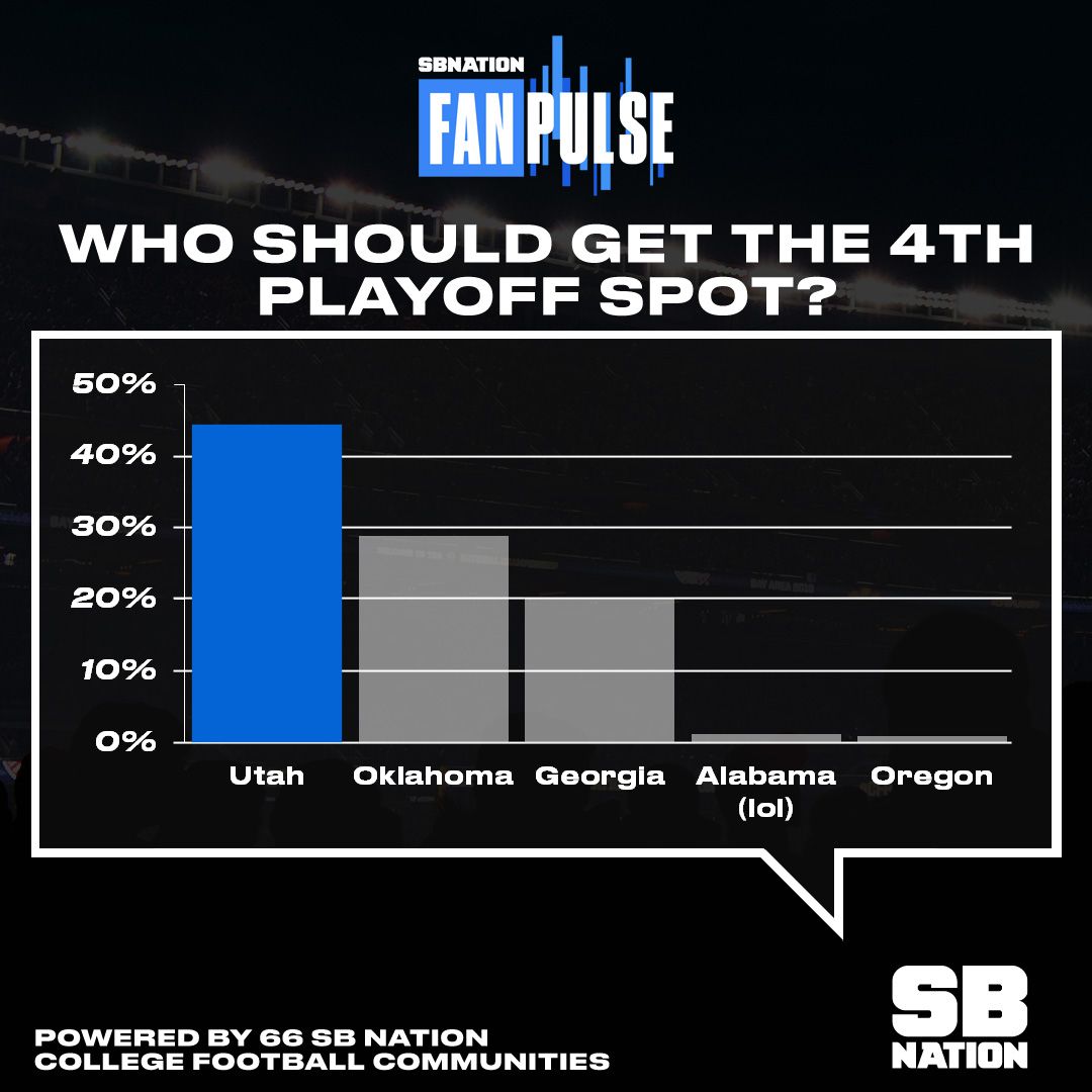 Most SB Nation readers tend to side with Utah. I don’t disagree that they’ve played really well, but the winner of Oklahoma/Baylor is intriguing to me. Baylor especially intrigues me, because if they won in the Big 12 Championship, their sole loss would be to a great OU team who they then beat in the rematch. The fact that they aren’t mentioned at all in this discussion shocks me. This year is a great case for an 8 team playoff in my mind.