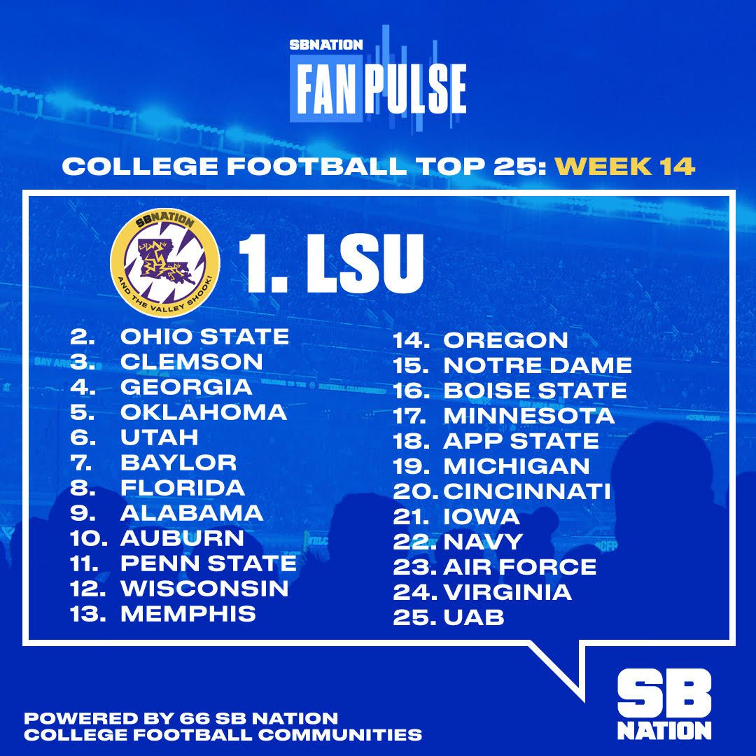 The top 25 has shaken out with SB Nation fans rebuking the playoff, keeping LSU locked in the first seed. I don’t understand what Ohio State has done that LSU hasn’t, but man I disagree with the committee. Joe Burrow alone is probably enough to push them ahead in my mind.