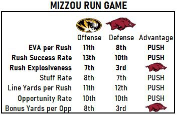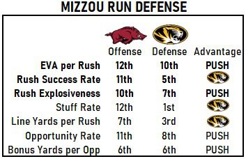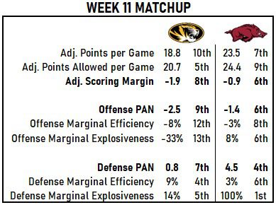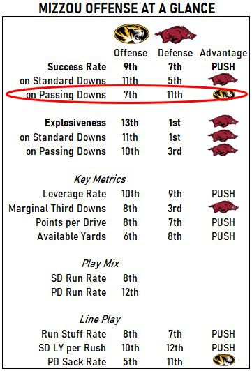 I’ve circled the key matchup of the whole game. Passing downs success rate defense doomed the Hogs against Texas A&M and LSU, and for Mizzou, it’s one of the few matchups the Tigers can win on offense.
