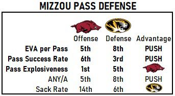 The Hogs can stop the run all they want (and they probably will) and they can get Mizzou behind the chains at a decent clip (they probably will), but if they allow a 56% passing downs success rate for the second straight game, this will be a loss. You don’t even need to see any other stats. It’s the big weakness of this zone.