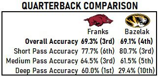 The Tigers’ only real strength on offense is an ability to stay efficient in the passing game. Freshman Connor Bazelak has played well, and while big plays haven’t been there, the short ones have. Bazelak is quite accurate on short passes, which is a problem for the Hogs:
