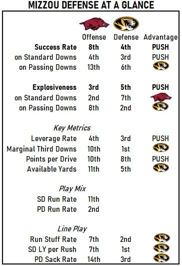 - Mizzou boasts the SEC’s best third down defense and a stifling defensive front that will likely limit running room