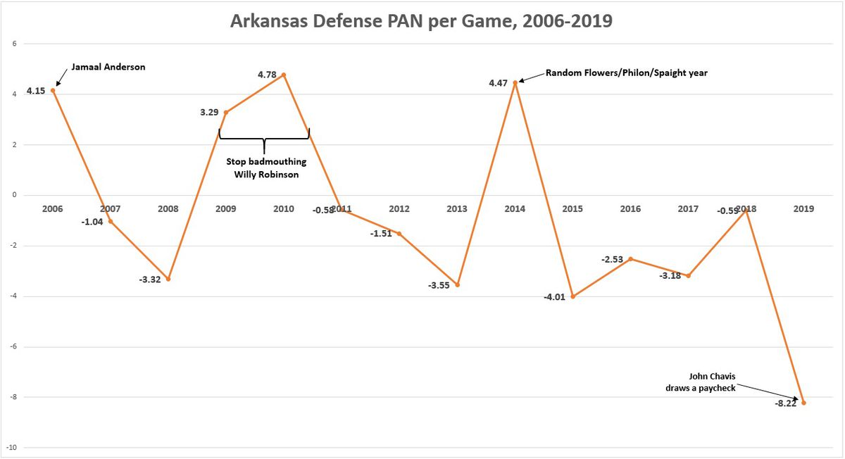 The Hogs were 106th in Defensive PAN per game, worst in the SEC and second-worst in the entire Power Five, barely edging out Rutgers.