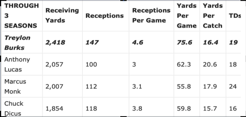 So, yes, in terms of career receiving yards and touchdowns, Burks trails guys like Jarius Wright, Anthony Lucas and Cobi Hamilton. But it’s short sighted to focus on the career numbers when Burks was head and shoulders above the rest on a per-game basis.